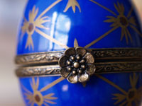 コバルトブルーのような美しい色合い。リモージュは卵のシリーズも豊富。留め金のところでパカッと開くようになっています。開けた時の形も実に美しいです。