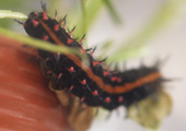 | 六郎が蛹になりました。太郎のときと同じようにきれいな銀色の光る突起が見えます。残る七郎(一番最後の幼虫です)は、相変わらずむしゃむしゃ食べまくっています。アップで撮るとこちらに気づいているのか、顔をむくっとあげ小さな目で見つめているような気がします。君も早く蛹になって元気に飛び立ってよね。 |