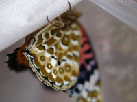 それにしても蛹の実に美しいこと。よく見ないとわかりませんが、体の下のほうに銀色のきらきら光る突起のようなものがあります。まるで金属でできているかのよう。昆虫は自然界で一番不思議ないきものではないでしょうか。 |